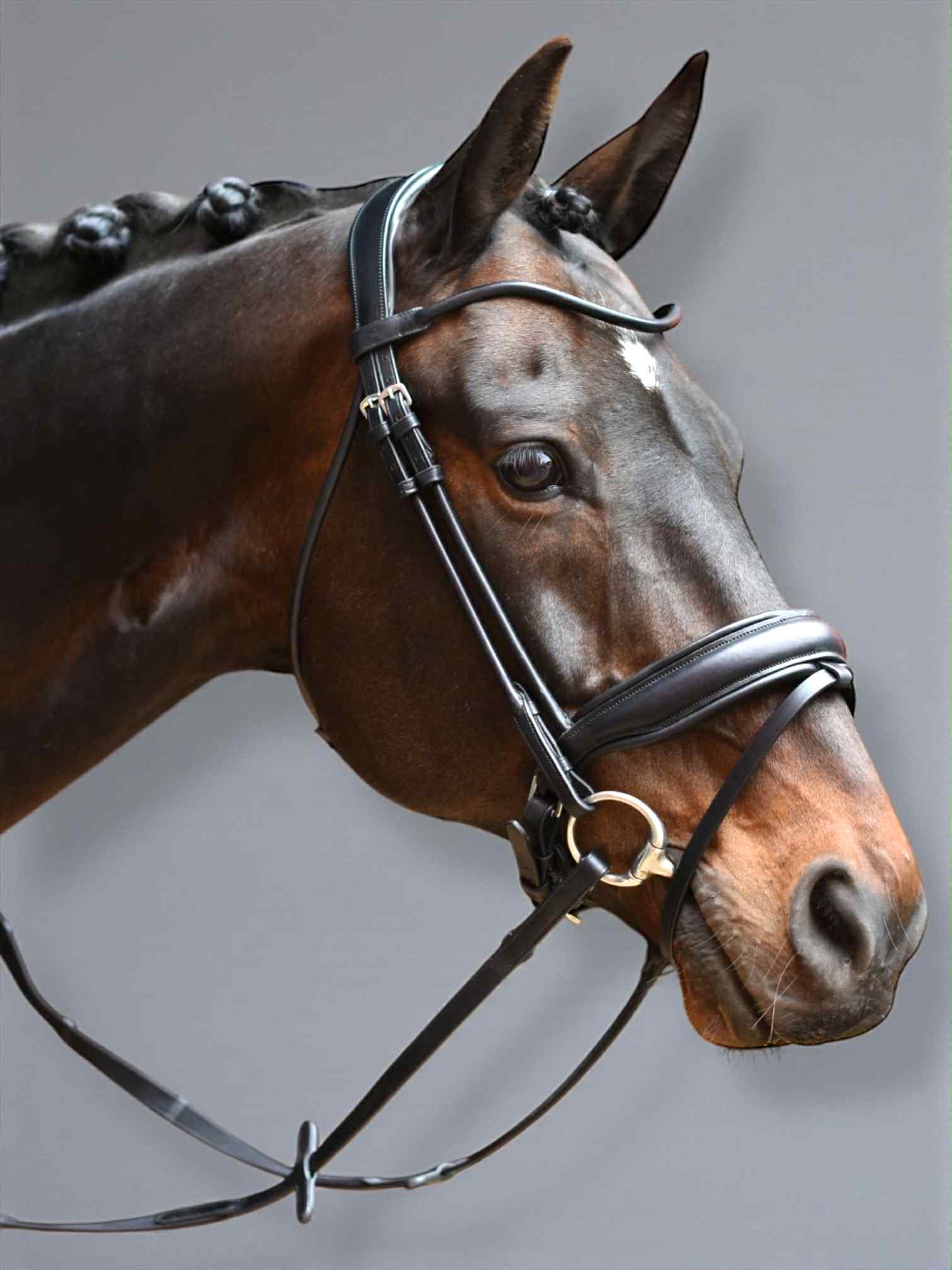 Das anatomische Monocrown-Genickstück folgt der natürlichen Kopfform des Pferdes. Es verteilt den Druck gleichmäßiger und bleibt dabei bis zu 4,5 cm breit. Genau deshalb erfüllt das Zaumzeug die FEI-Regeln und passt perfekt für Training und Turnier.